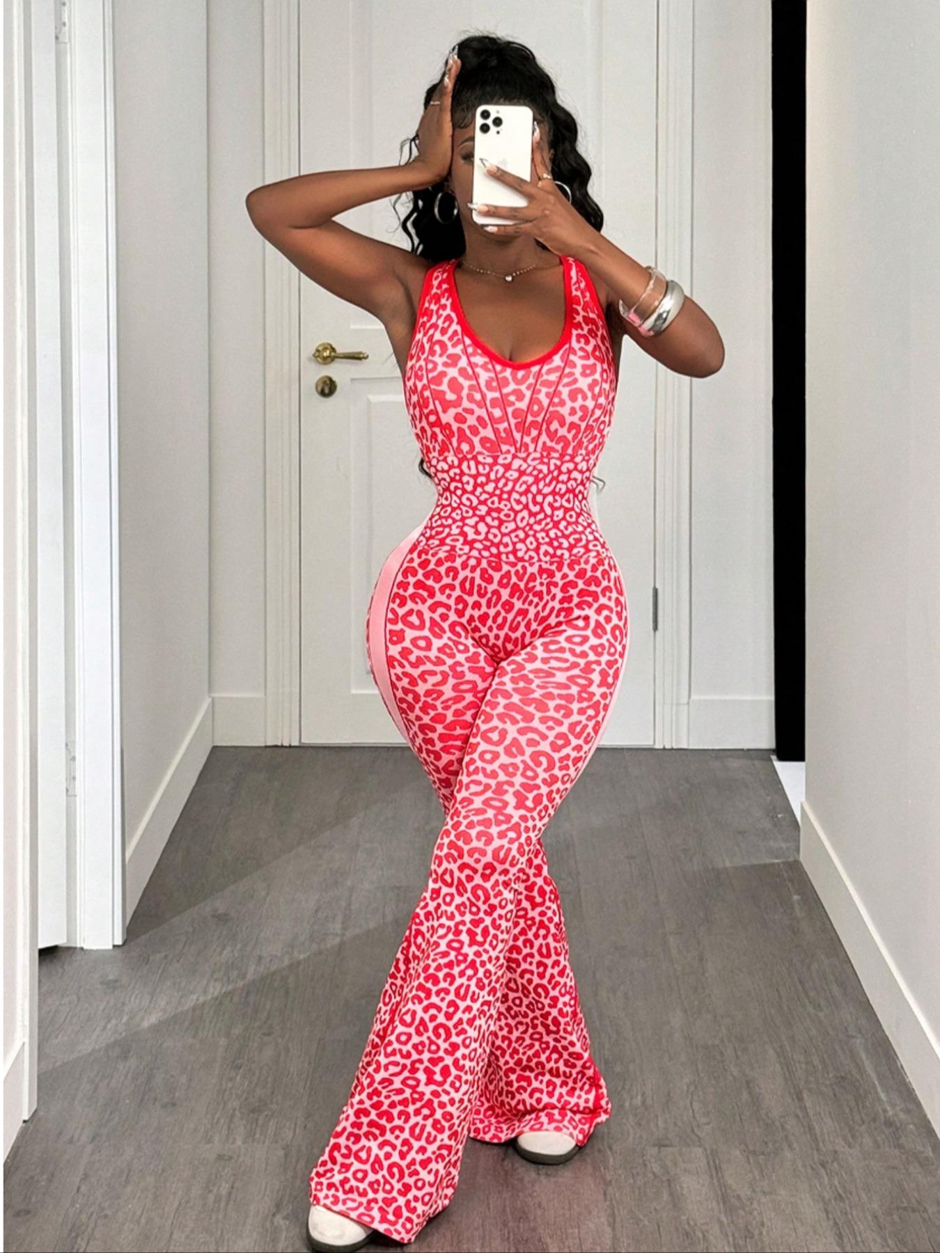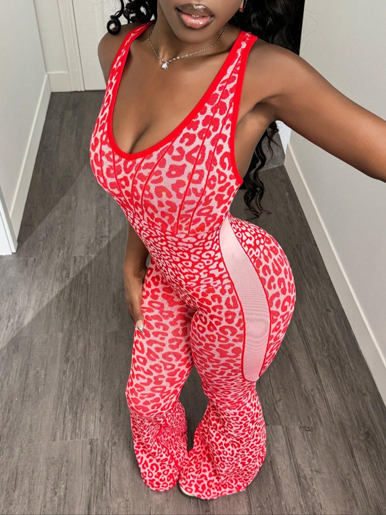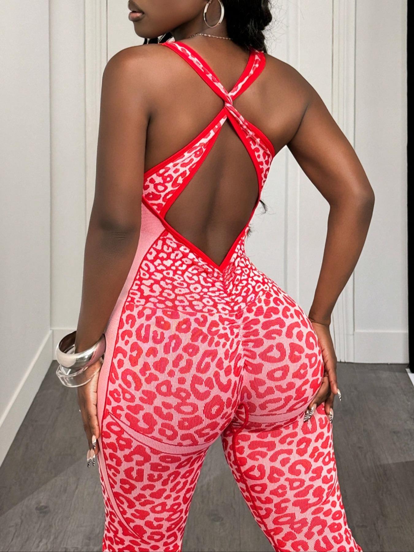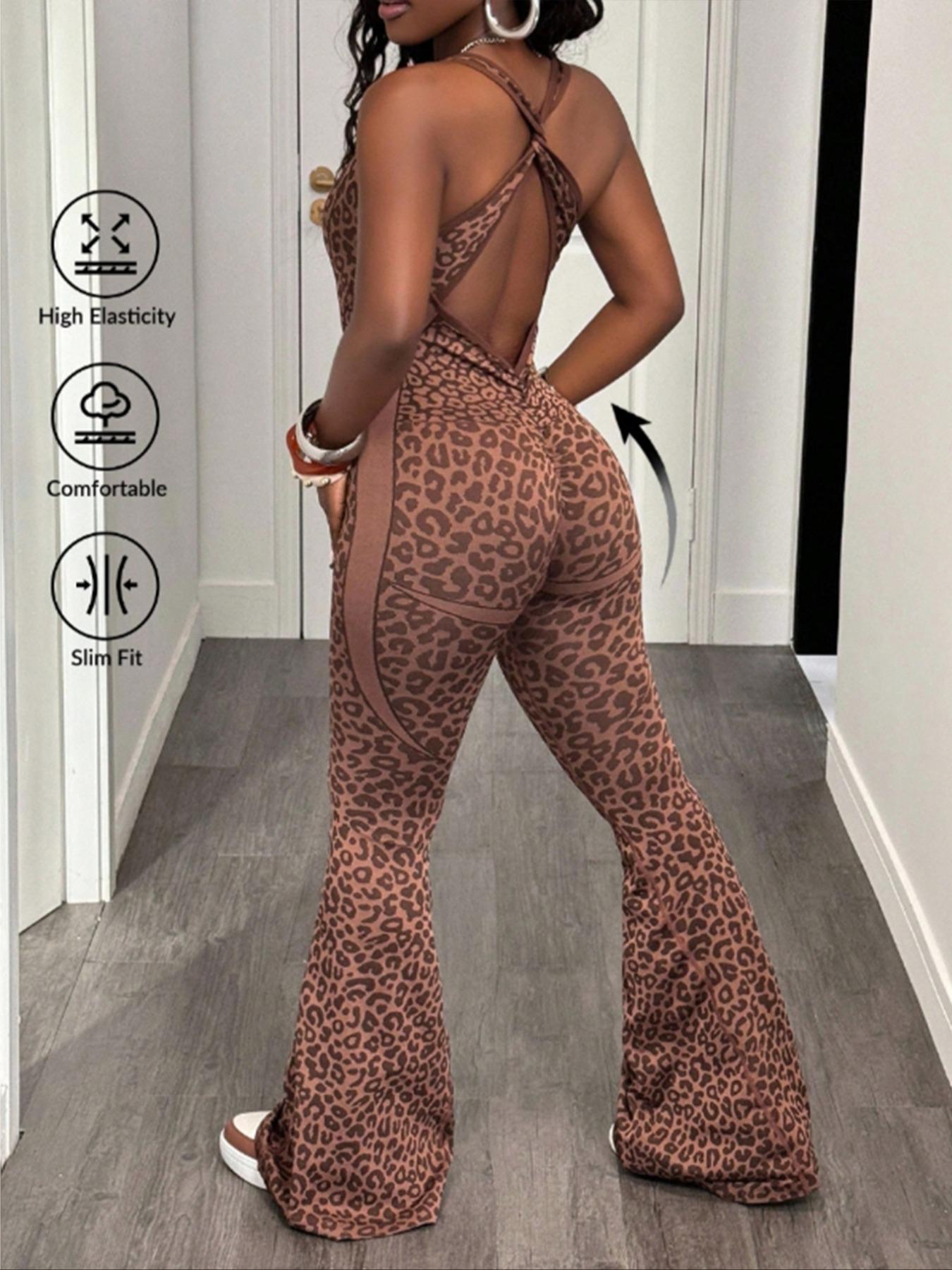 Women's Seamless Leopard Print Yoga Jumpsuit, High Stretch Waist Cinching Micro Flare One-Piece, Removable Cup Pads, Backless Sports Jumpsuit