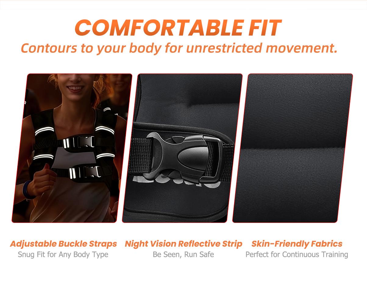 This weighted vest enhances your workouts by providing the perfect amount of weight. Whether you're strength training, running, or walking, this vest is a great addition. The adjustable straps ensure a comfortable fit, while the reflective stripes add safety. Perfect for men and women looking to improve their fitness.